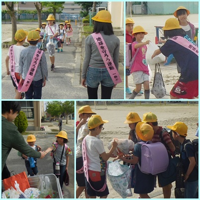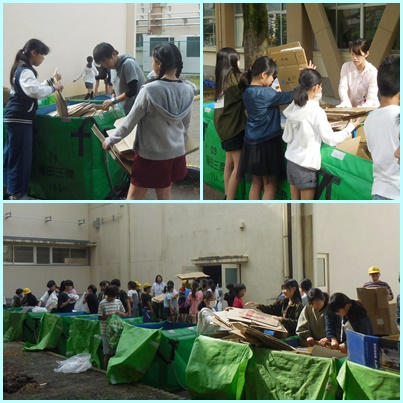 本校では、日頃から新聞紙や牛乳パック、アルミ缶、ペットボトルなどの資源ゴミをみんなで持ってくる「地球を守ろう運動」を行っています。