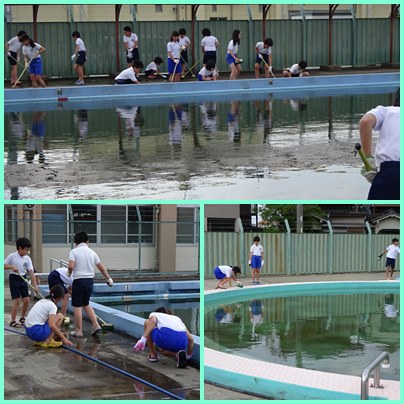 5年生が、プール掃除をしました。5年生は、プールのまわりやトイレ、更衣室などをきれいにします。みんなのためにもくもくと掃除をしました。