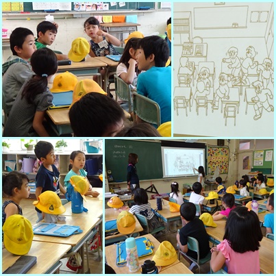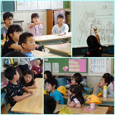 休み時間中の教室内の様子を描いたイラストを見ながら、どんな危険が考えられるか、どうすれば危険を軽減できるのかなどを話し合いました。