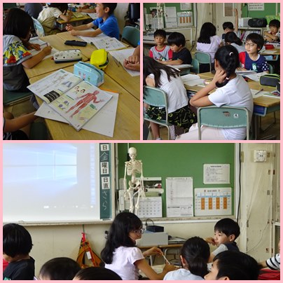 4年生の理科「動物のからだのつくりと運動」の学習です。人の体の全身の骨や筋肉のつくりと動き方について調べます。人の体の模型を観察したり、資料を活用したりして、全身のつくりと動き方を調べます。