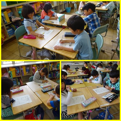 1年生の様子です。先週、2年生と学校の中を探検して見つけたことを絵と文でかいています。