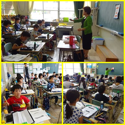 3年生は、小牧市書道連盟の志村松琴先生に来ていただいて、書道の基本を教えていただきました。紙の折り方、書くときの姿勢、筆の持ち方・・・・などをしっかり学び、「一 二」の文字を丁寧に書きます。