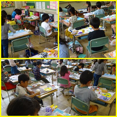 2年生の図工「ざいりょうから ひらめき」の学習です。いろいろな材料を工夫して使い、自分の表したいものを作ります。材料の特徴をうまくいかしています。