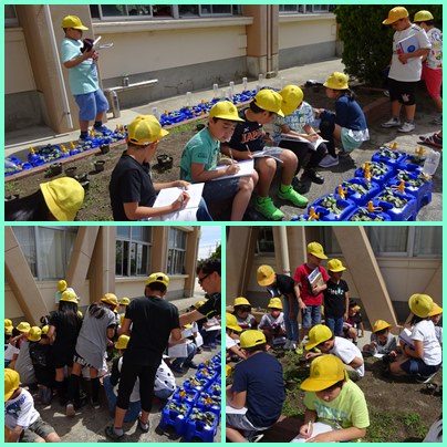 4年生の理科「へちまの観察をしよう」の学習です。へちまの本葉が出てきたので、観察しています。どのように大きくなっていくのかを想像しながら観察します。