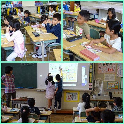 1年生の道徳「いいことをしているのは どのこかな」の学習です。大きく映し出した絵を見て、どのこがいいことをしているのかを探します。なぜ、それがいい行いなのかも考え、公共の場でどのような行動をとることがよいのかを話し合います。