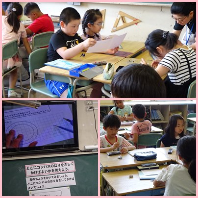 3年生の算数「円と球」の学習です。コンパスを使って模様つくりに取り組みます。コンパスの針をさす場所がわかれば、いろいろな模様がかけることを学びます。
