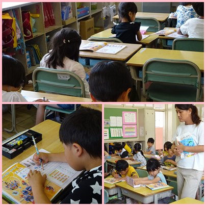 1年生の算数「いくつといくつ」の学習です。いくつといくつにわかれるのか、色をぬりながら、数の分解・合成を学んでいます。