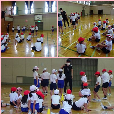 3年生の体育「ボール運動」の学習です。ソフトバレーボールを使って、チームでボール運動を楽しみます。