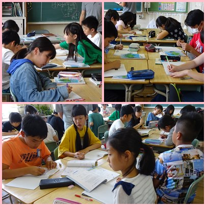 6年生の算数「分数×分数」の学習です。分数を使った文章の問題を解いていきます。グループで確認し合って解いてきます。
