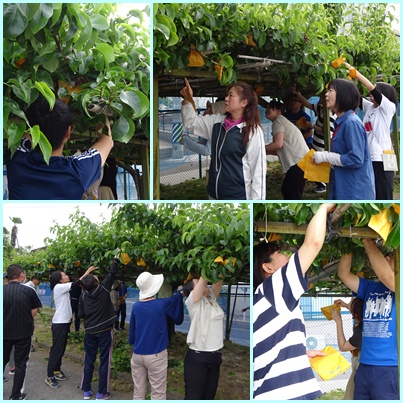 梨園の梨の実に袋をかける作業を行いました。