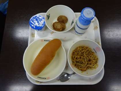 牛乳 小型ロールパン いか入り焼きそば 白ごまつくね ヨーグルト