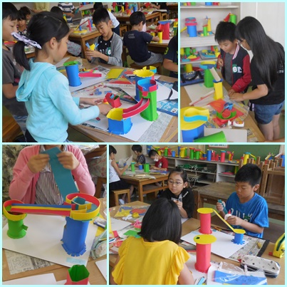 ビー玉が転がり落ちる仕組みを生かして、楽しく遊べるおもちゃを制作しています。