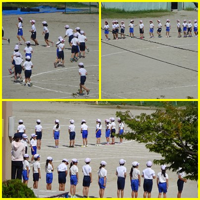 2年生です。運動会の練習をしています。暑い中ですが、こまめに休憩をとりながら練習します。
