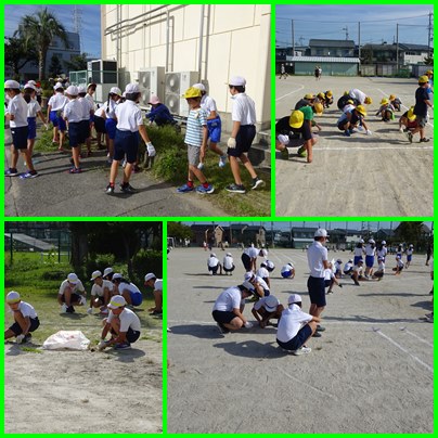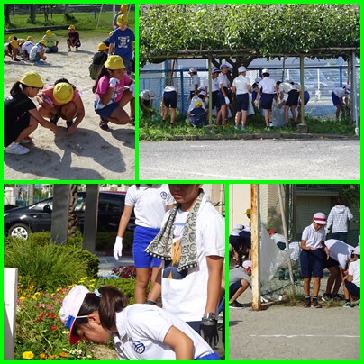 朝の時間を使って、全校で除草を行いました。運動場、梨園、PTA花壇、学年花壇、校舎周り・・・分担に従って、一生懸命草をぬきました。暑い中、がんばりました。おかげできれいになりました。