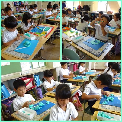 2年生の図工「思い出を粘土で表そう」の学習です。夏の楽しかった思い出を、粘土で表現しています。泳いだこと、遊んだこと、食べたこと・・・・たくさん思い出しています。