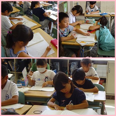 2年生の国語「大すきなもの 教えたい」の学習です。すきな食べ物、遊園地、スポーツ・・・・自分の伝えたいことをメモをもとに作文に書いていきます。
