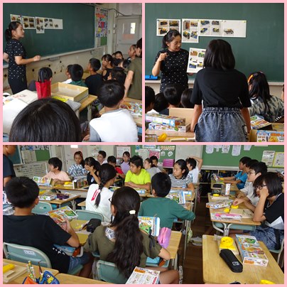 6年生の図工「テープカッター」の学習です。板を使って自分だけのテープカッターを作ります。どんな作品をつくるのか、例を見ながら考えます。