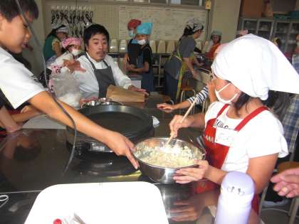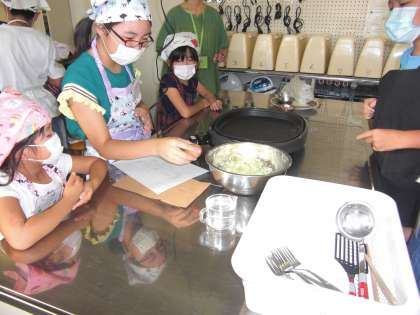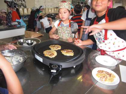 今日は、伊藤 健シェフにおこしいただき、お好み焼きと、ポップコーンを作りました。材料を全部入れて混ぜるだけで、作り方はシンプルでしたが、とてもおいしくできました。ポップコーンは、少しこげてしまいましたが、レンジから聞こえる「ポンポン」とはじける音を聞きました。