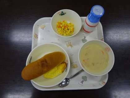ロールパン 牛乳 豆乳シチュー オムレツ コーンソテー