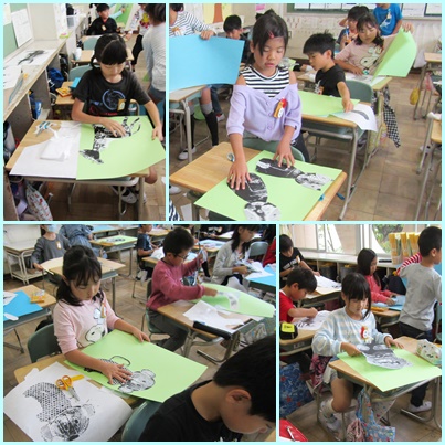 切り抜いたら台紙の上に並べて、どんな場面を表す絵にしていくのかを考えます。