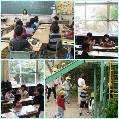 教室で「秋と言えば・・・」といろいろな言葉を思い出したあとは、実際に外を歩いて“秋探し”をします。