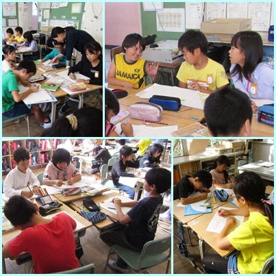 今日は、学習のまとめとして、合同な正三角形や二等辺三角形をしきつめていろいろな模様をつくる作業をしています。
