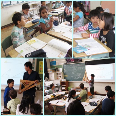 角の大きさの比べ方、大小の判断の仕方など、三角定規を操作しながら考えます。