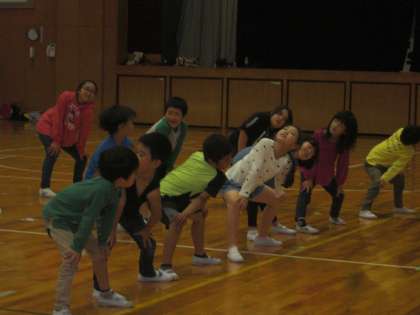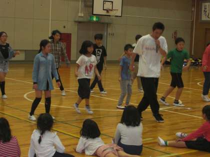 先生のダンスを見せてもらった後、ウォーミングアップをして、ダンスをしました。ボリュームをあげた音楽の中で、ダンスに興味がある子どもも初めての子どもも思いっきり体を動かしていました。