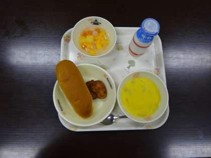 牛乳 ミルクロールパン 秋のコーンクリームスープ 愛知の大豆入りナゲット ナタデココフルーツ