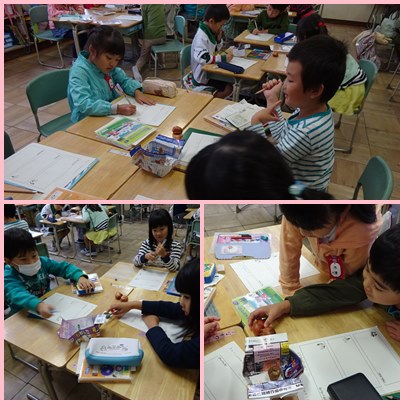 1年生の生活科「きゅうこんをかんさつしよう」の学習です。チューリップの球根をグループで観察しています。