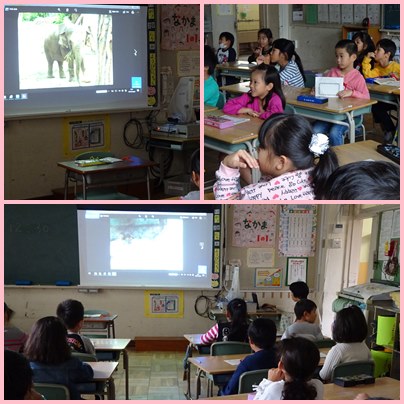 1年生の校外学習に向けてのお話です。写真を見て「動物園の動物」について、事前学習です。動物を見るときのポイントや注意事項を聞いています。