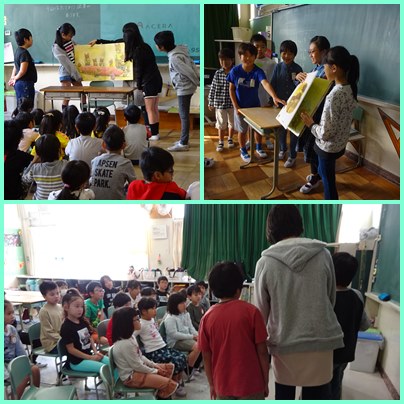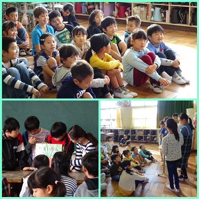 今朝のモチノキタイムを使って、読書週間の取組の「縦割り読書」を行いました。5年生が、大型絵本や紙芝居の読み聞かせを行いました。この日のために5年生は、読む練習をしてきました。そして、1年から4年生の児童は、最初から最後まで聞き入っていました。