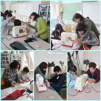 各グループに1人ずつ学校サポーターの方が来てくださり、ミシンの使い方をはじめとした作業の進め方のアドバイスをしてくださっています。