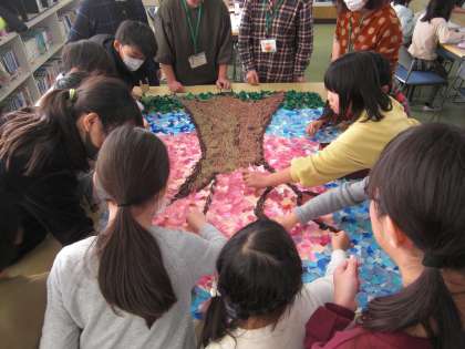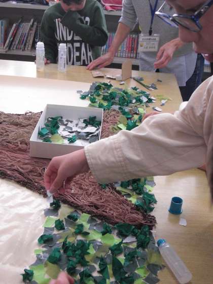 木の部分は毛糸で、花・空・草の部分はちぎり絵で、1年生から6年生まで全員で仕上げました。
