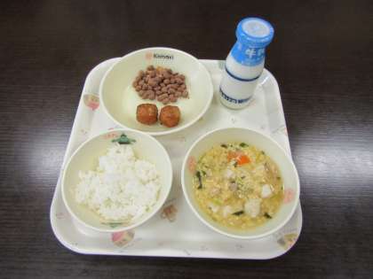 大豆のココアがらめ、ごはん、牛乳