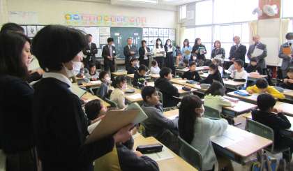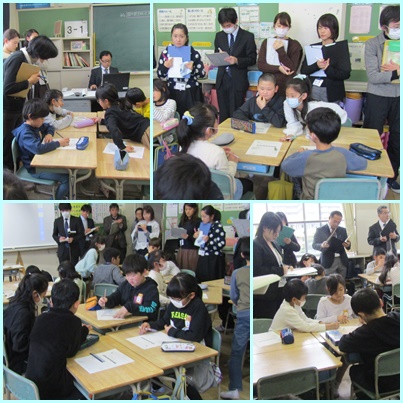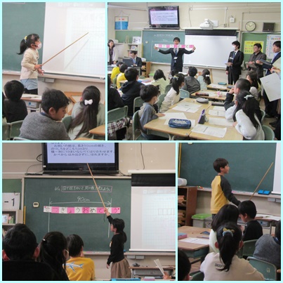 教育委員会や市内他校から見に来てくださった先生も加え、多くの先生方に囲まれて子どもたちは緊張気味でしたが、友だちと頭を寄せ合いながら熱心に学ぶことができました。