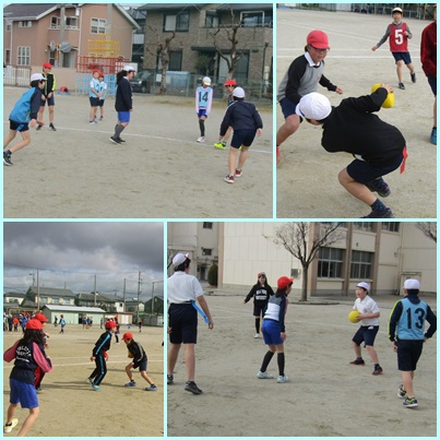 ゴール型のボール運動としてタグラグビーに取り組んでいます。