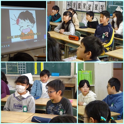 5・6年生同様、保健委員会の子どもたちがつくったビデオを見ながら、「けがの防止」について考えました。