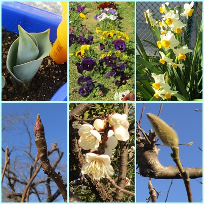白梅が満開の花を咲かせ、モクレンは独特の芽を大きく膨らませています。