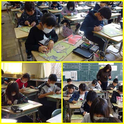 4年生の図工「ほって すって 見つけて」の学習です。自画像を丁寧に彫っています。集中して一彫、一彫・・・・・出来上がりが楽しみです。
