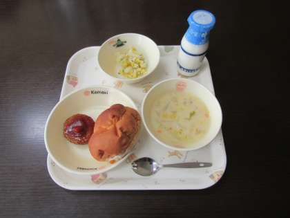 コーンポテト、りんごパン、牛乳