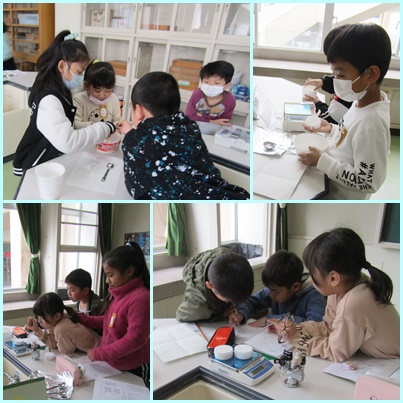今日は、砂糖と塩の重さを比べる実験をしています。