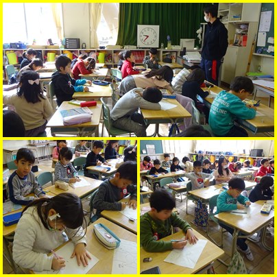 1年生の学習です。「たのしかったこと」を思い出して、大きくかいています。この1年いろんな楽しいことがあったね。
