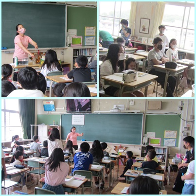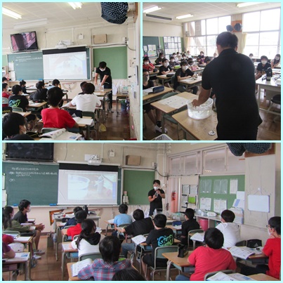 ものの燃え方と空気の関係について、先生が行う示範実験を見ながら考えます。