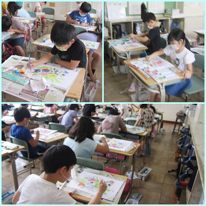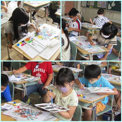 混色や水の使い方など工夫をしながら花の絵に色を塗ってみます。