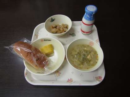 あおさの白味噌汁、葱玉焼き、牛乳、