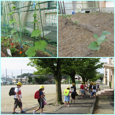 たっぷり雨が降って時折陽が射す、気温や湿度が高いこの天気は植物の成長にはもってこいで、2年生が先日植えたサツマイモや4年生が育てているヘチマも元気に成長しています。