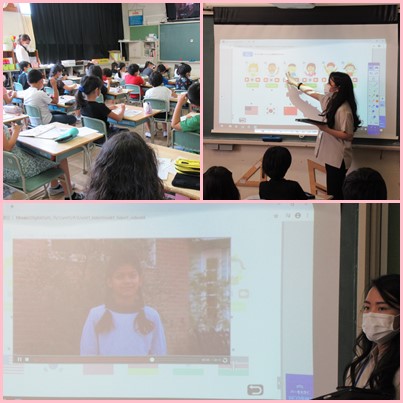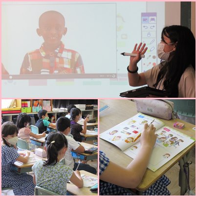 映像に映った友達が、それぞれどこの国から来た子なのかを聞き取り、国旗を選んで線で結んでいます。