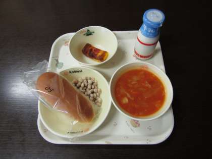 鶏肉のトマト煮、ベーコンエッグ、牛乳、