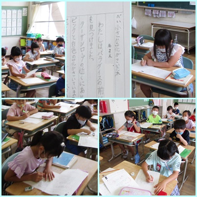 校庭を歩いて見つけたものについての報告文を書いています。
